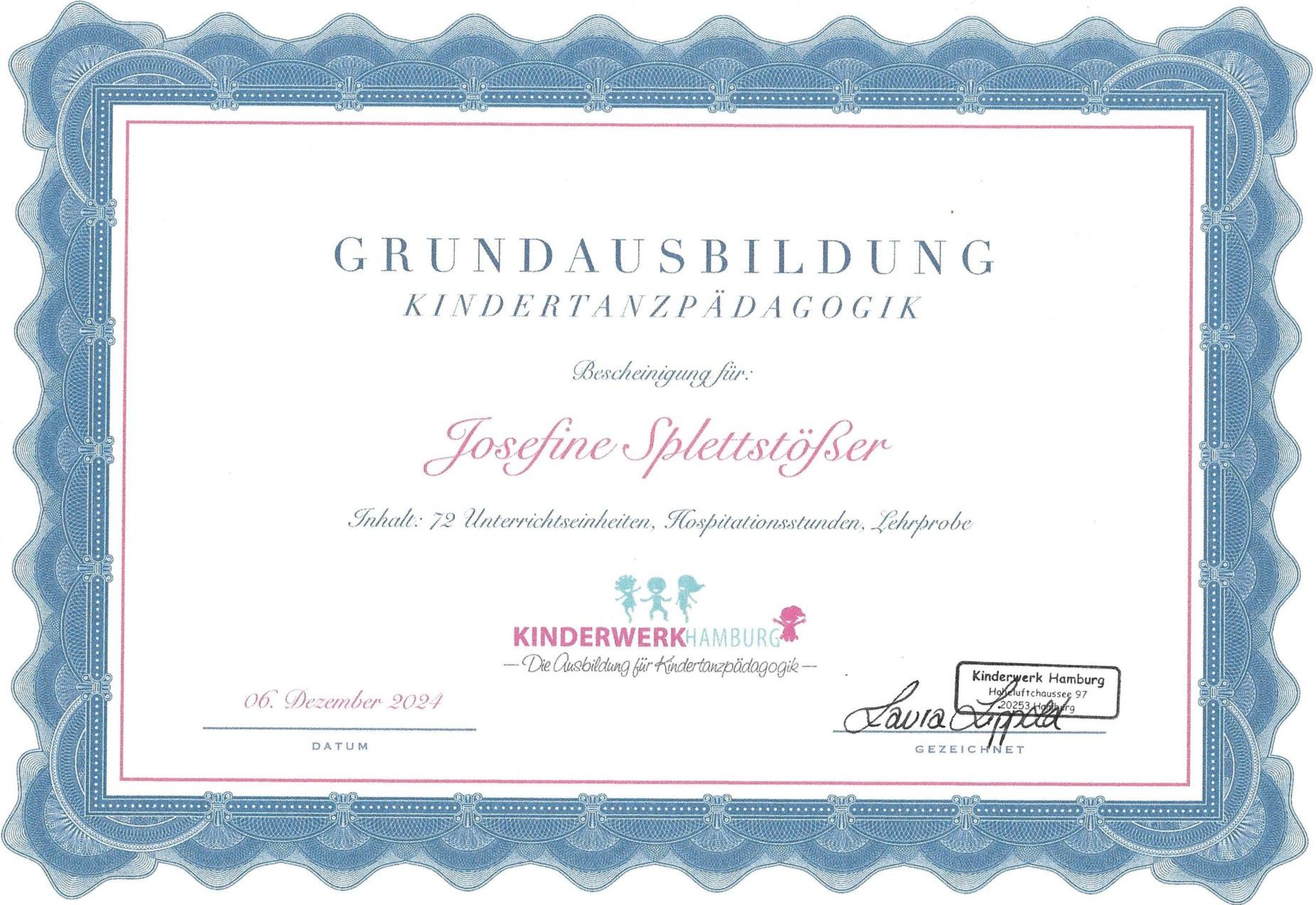 2024 habe ich die Ausbildung zur Kindertanz-Pädagogin beim Kinderwerk Hamburg abgeschlossen